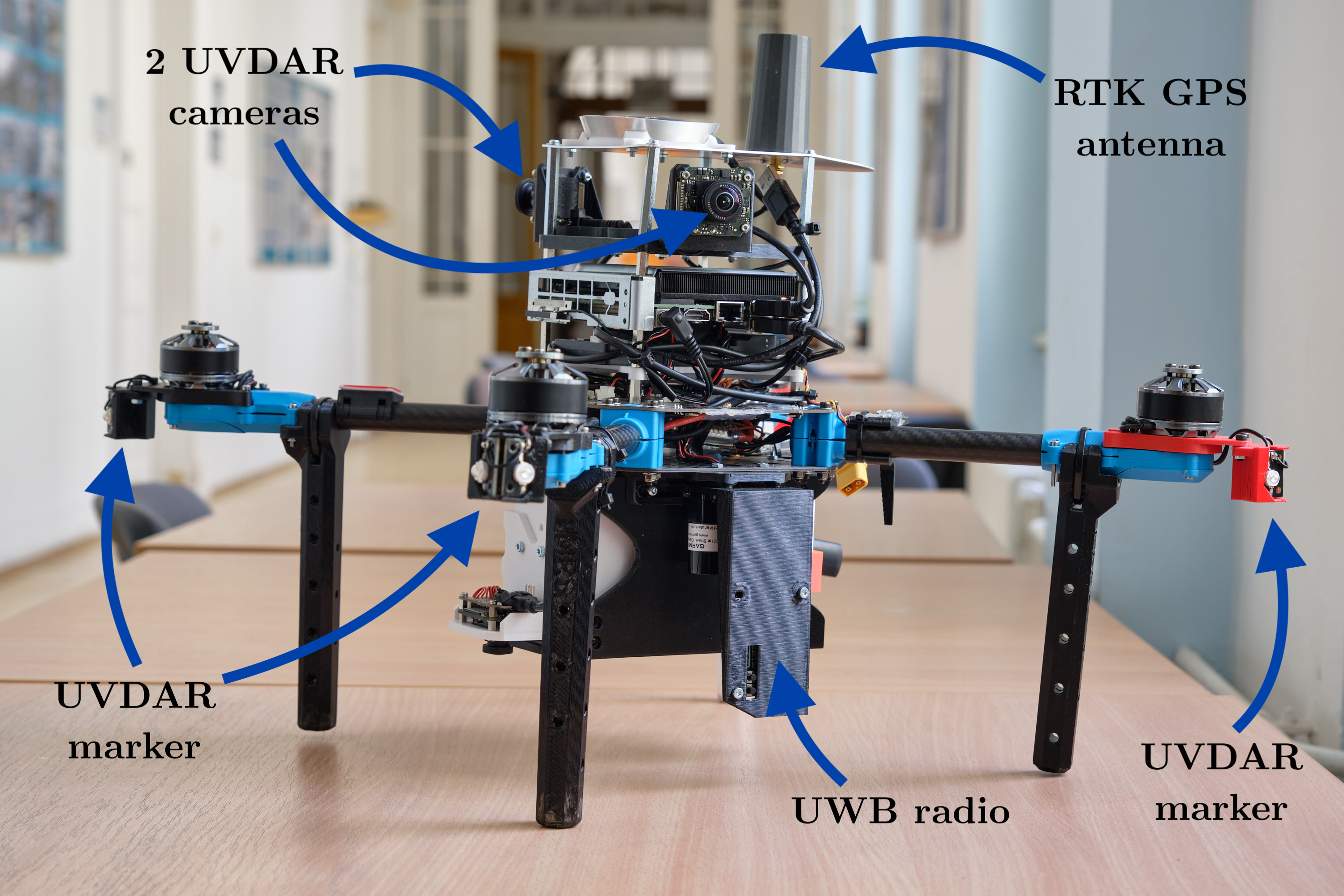 Extensive research has already been conducted on the utilization of Ultra-Wideband (UWB) technology in Unmanned Aerial Vehicle (UAV) applications. Majority of published articles primarily concentrate on the implementation of UWB technology using an architecture based on UWB anchors [5,8]. Nevertheless, this particular implementation is unsuitable for deployment in potentially hazardous environments, particularly for search and rescue applications. Article Decentralized Visual-Inertial-UWB Fusion for Relative State Estimation of Aerial Swarm [11] proposes system architecture and the fusion algorithm, which combines visual-inertial odometry (VIO) and UWB ranging measurements in a tightly-coupled manner. However, this approach would be ineffective in environments lacking distinct features.