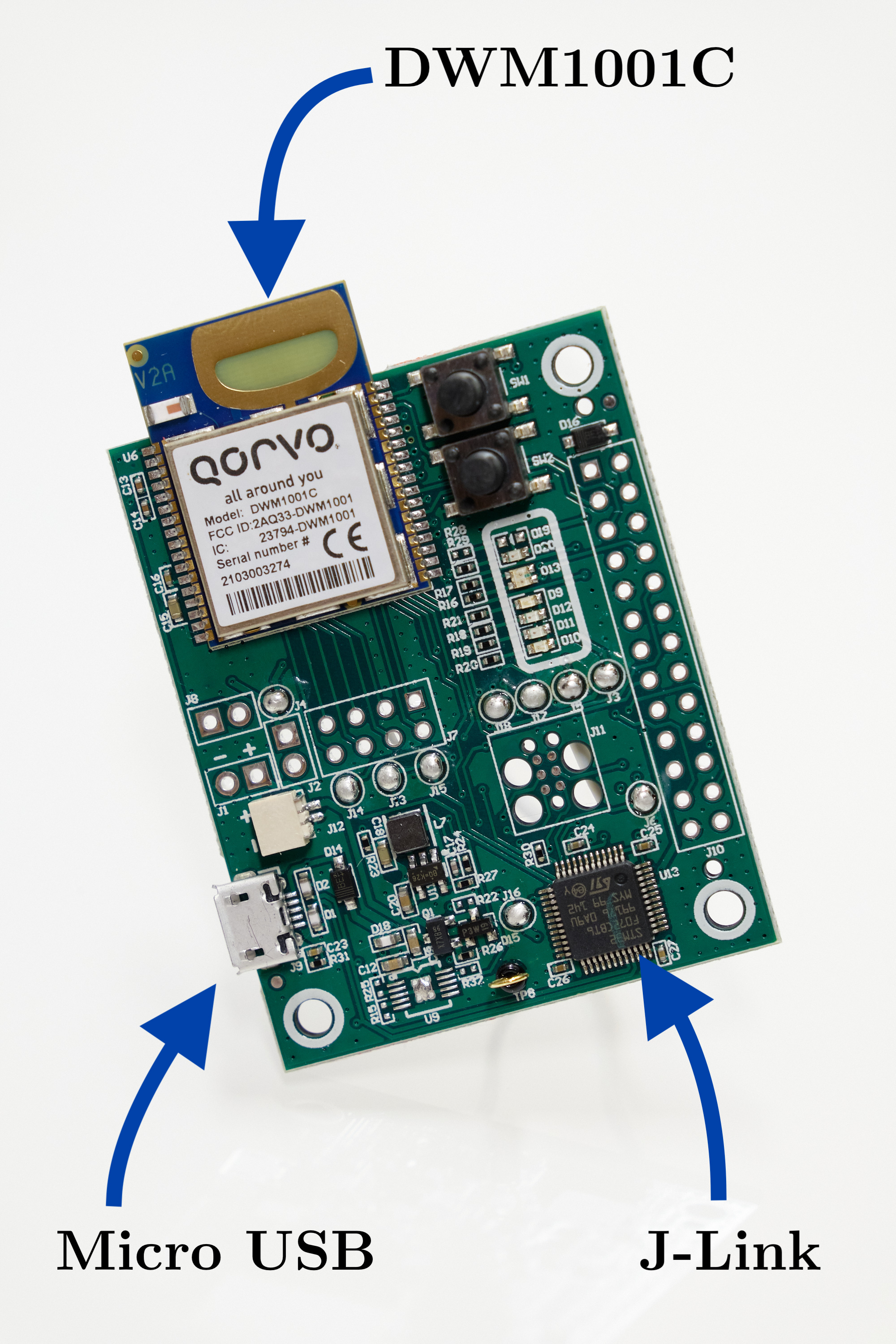 Qorvo DW1000 is a UWB PHY radio developed and manufactured by Qorvo2. The proposed solution utilizes a Qorvo DWM1001-DEV development board which consists of a DWM1001C transceiver module and a J-Link debug probe. Figure 5.2 showcases the printed circuit board (PCB) of the Qorvo DWM1001-DEV. The DWM1001C houses the DW1000 radio chip, nRF52832 microcontroller, 3.0 V, and 1.8 V power supplies. The DW1000 is connected to the nRF52832 via the SPI bus. The module also includes Bluetooth connectivity and an accelerometer, but it remained unutilized.